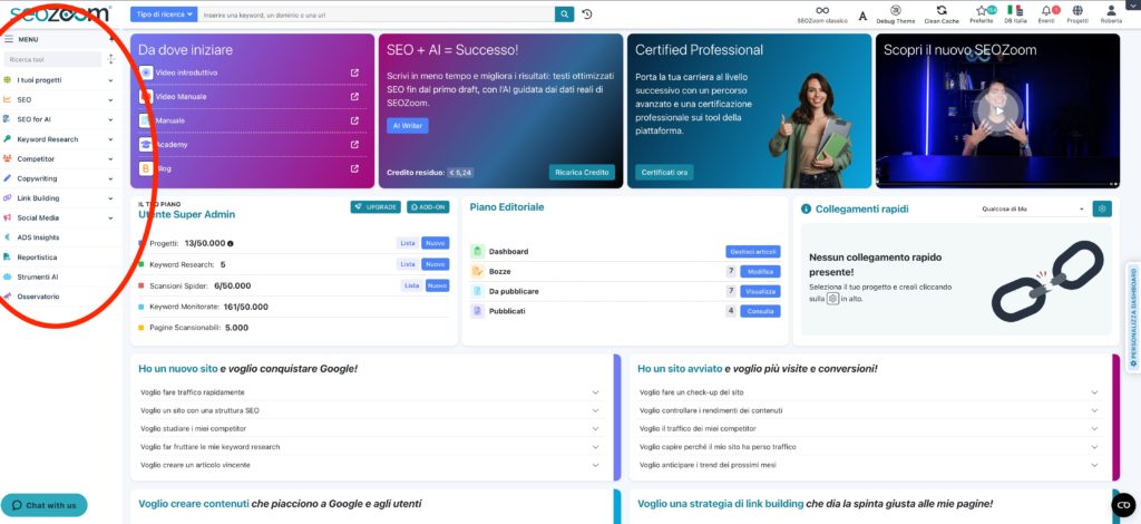 La colonna di sinistra è la tua cassetta degli attrezzi, il punto di accesso a tutte le funzionalità operative di SEOZoom. La sua struttura è organizzata per aree di lavoro, seguendo una logica basata sulle attività che svolgi ogni giorno.