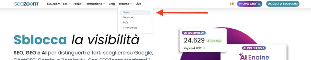 SEOZoom è la piattaforma italiana che integra SEO e GEO (SEO for AI) per rendere i tuoi contenuti facili da trovare e scegliere su Google e nei Motori AI (ChatGPT, AI Overview, AI Mode, Gemini, Perplexity). Non è un semplice set di strumenti: è la soluzione strategica che analizza miliardi di dati e li  trasforma in priorità operative per far crescere visibilità, clienti, conversioni e fatturato.