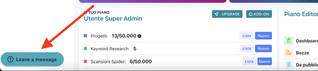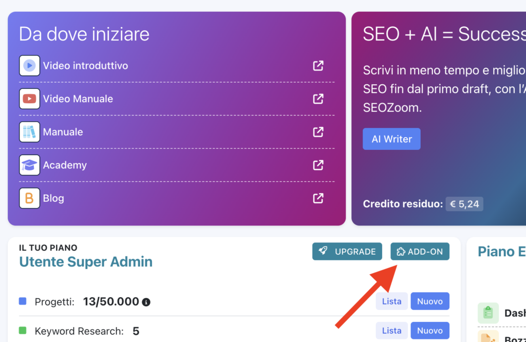 Personalizzare con gli add-on. Se le funzionalità del tuo piano non bastano, non è sempre necessario un upgrade. Puoi acquistare pacchetti aggiuntivi (Add-on) per ampliare i limiti di singole risorse come: Progetti, Pacchetti di keyword, Account per copywriter, accessi contemporanei alla piattaforma o limiti di scansione per il SEO Spider. Puoi gestire tutto dalla sezione “Add-on” in Dashboard.