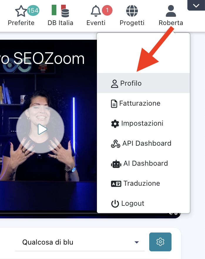 Tutte le funzioni legate al tuo account si trovano nell’area Profilo, accessibile dal menù in alto a destra. Qui puoi gestire dati personali, fatturazione, abbonamenti e le nuove dashboard dedicate alle API e agli strumenti AI.